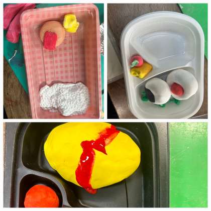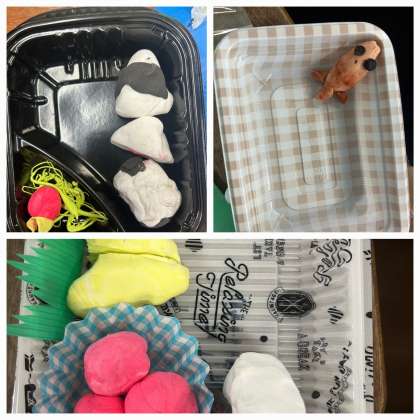 お家で食べたお弁当のパックなどを持って来て、粘土で作った具材を詰めました。エビフライやハンバーグ、とんかつやたこさんウインナーなど思い思いのおかずを作っていました。いっしょうけんめい作っていた児童の手は、カラフルに彩られていました。