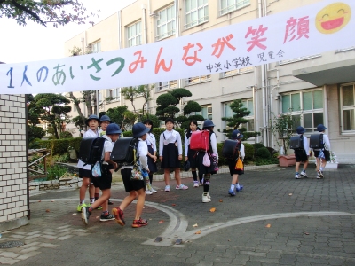 10月28日(水)8時、今日は「健康委員会」の児童の皆さんが、先生方と一緒に正門のところで朝の「あいさつ運動」を繰り広げました。