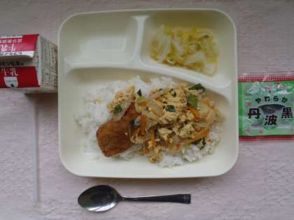 カツ丼も、子どもたちに大人気の献立です。カツとご飯に、具の甘辛い汁がしみ込んで、どんどん食べられます。