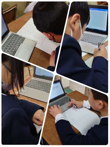 6年生の教室に入るとあまりの静けさに驚きました。子ども達はみんな真剣な表情で原稿用紙に向かっていました。卒業文集の下書きをワードで書いて、先生に添削してもらってから清書です。驚くほど美しく整った字を書いている子がたくさんいました。ボールペンをぎゅっとにぎっているので、ときどきは力を抜いてリラックスもして、最後までがんばってほしいなと思いました。6年生、がんばれ!!