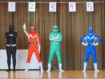 第1問【写真左】はI先生を当てる問題です。4人全員がレンジャー?に変装していて、なかなかわからなかったようです。答えは3番でした。第2問【写真右】はW先生を当てる問題で、いろいろな衣装をまとっていて、これもわかりずらかったようです。答えは2番でした。