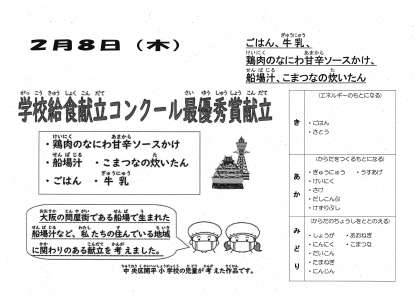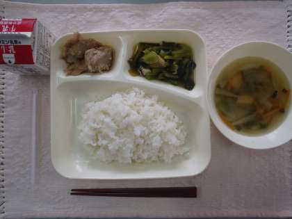 給食の船場汁は、さけの角切りを使っています。魚のだしがきいた汁物です。