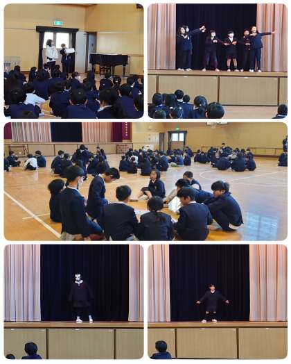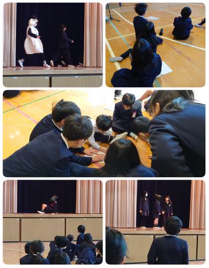 今日の児童集会は、「何人通ったかな?」でした。ルールは、舞台上のカーテンとカーテンの間を「人」や「お面をかぶって動物の動きをしている人」、「キャラクターもお面をかぶっている人」、「ヒーロー」などが通ります。通っている中で、普通の人の数だけ数えます。今日は解答用紙に1年生が答えを書くことになりました。