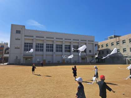 1年生は、凧に思い思いの絵を描き、運動場であげました。