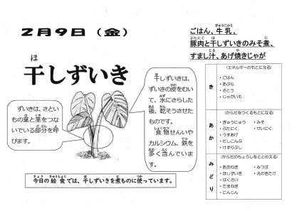 給食では、しっかりあく抜きしているのであまり感じませんが、干しずいきは、少しえぐみがあるので、それを和らげるためにみそと一緒に調理することが多いです。