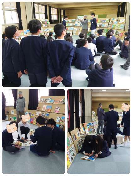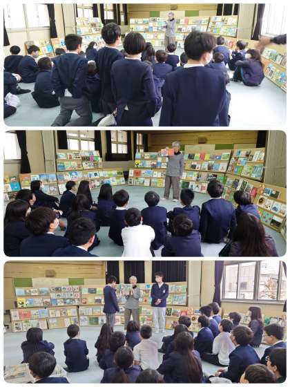 今日は、3・5・6年生が絵の本ひろばに集まりました。小さい学年のころから絵の本ひろばに親しんでいる子ども達は、とてもリラックスして加藤先生とお話をしながら絵本のおもしろさに引き込まれていました。フリータイムは一人一人が好きな本を集めて友達と話しながら絵本に親しんでいました。