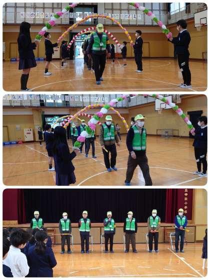 今日の朝会の時間に、毎朝お世話になっている中浜見守り隊の代表7名の方に来ていただき、「見守り隊のみなさんにありがとうを伝える会」を行いました。