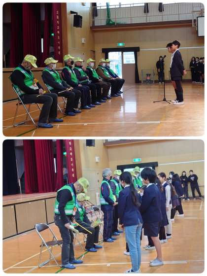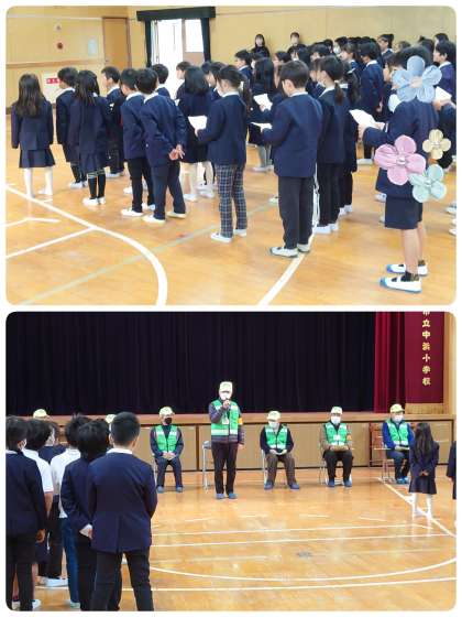 見守り隊の方に自己紹介をしていただき、一言ずつ、子ども達にお話もしてくださいました。子ども達からは、まず6年生の代表が感謝の言葉を伝えました。そして子ども達からお礼の手紙と歌をプレゼントしました。見守り隊の代表の方から子ども達へお話をしていただきました。お話を聞いていると中浜小学校の子ども達を大切にしてくださっている思いが伝わってきました。本当にいつもあたたかく見守ってくださってありがとうございます。これからもよろしくお願いします。