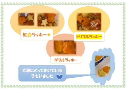ウインナーと野菜のケチャップ煮に、ラッキーにんじん&じゃがいもが入っていました。