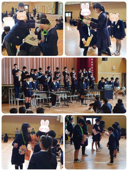 6年生からは、お礼のプレゼントと素晴らしい合奏を聴かせてもらいました。この日のために6年生はずいぶん前から「水平線」の練習をしていました。とても上手でみんなから大きな拍手が送られました。最後に6年生代表のあいさつ。すごく堂々としていてかっこいいメッセージを伝えてくれました。