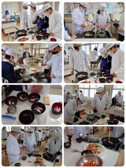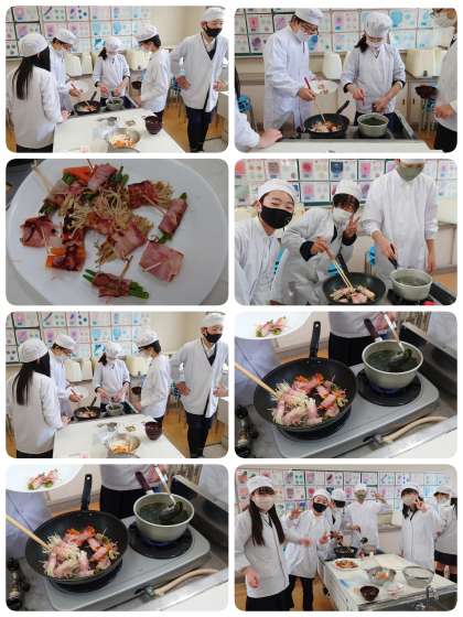 今日の料理実習では、「野菜のベーコン巻き」と「すまし汁」を作りました。