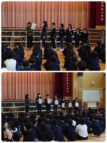賞状がたくさん届いているのでみんなの前で紹介しました。