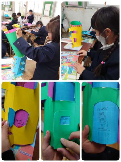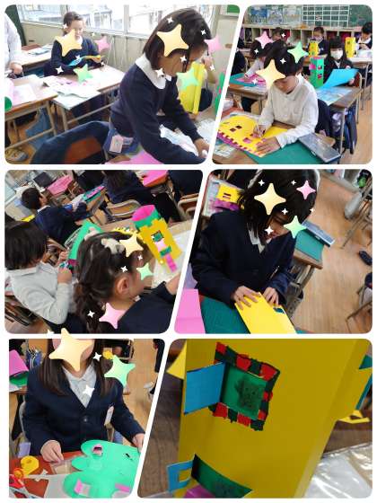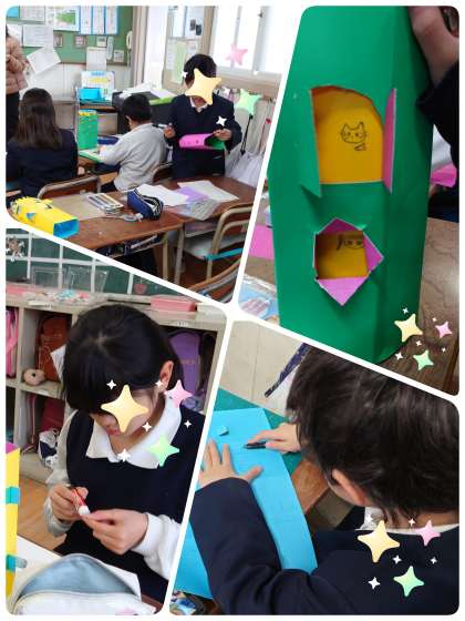 2年生が、工作をしています。カッターを使って窓を作り、その中からかわいい絵が見えるようになっています。いろんな工夫がされていて、どの子も見て!見て!!と、自分の作品を見せてくれました。これからもっと改良されていきそうです。