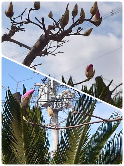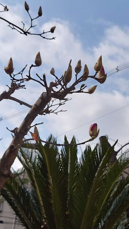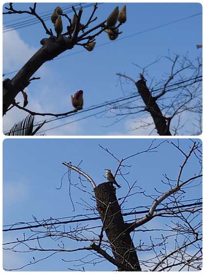 モクレンのつぼみが大きく膨らんできました、中からのぞいている花びらの色がとてもきれいです。今朝はツグミもやってきて、枝先にずっと止まっていました。朝のどんよりした雲なくなって、今はきれいなスカイブルーです。