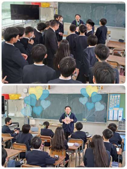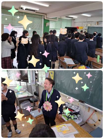 朝の時間に6ー1の担任の先生にプレゼントを渡すため、わたしと教頭先生と教務主任の先生と一緒に教室に行きました。ノリの良い子ども達に、教頭先生が「花道作って!」とお願いしたとたんに、机をばっと動かして、みるみるうちに花道ができました。すごいパワーに圧倒されました。プレゼントの花のメダルを渡して、一言お話をしてもらいました。今日は、メダルをずっとつけててねってお願いをしました。プレゼント作戦、大成功