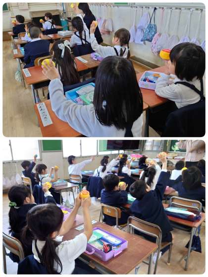 お道具箱に入っている持ち物を一つずつ確認して、自分の名前が書いているところも確認して、もう一度整理してお道具箱になおします。子ども達は、いろいろな約束を覚えて一つずつ学校生活に慣れていきます。子ども達は何にでも一生けんめい。目がキラキラしています。