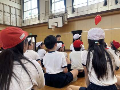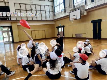 6年生の体育のウォーミングアップの様子です。先生に風船を返すため、パスを回しをみんな一生懸命に取り組んでいました。