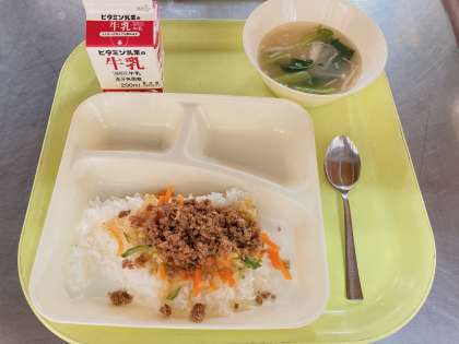 ご飯とお肉と野菜!全学年もりもりたくさん食べていました。