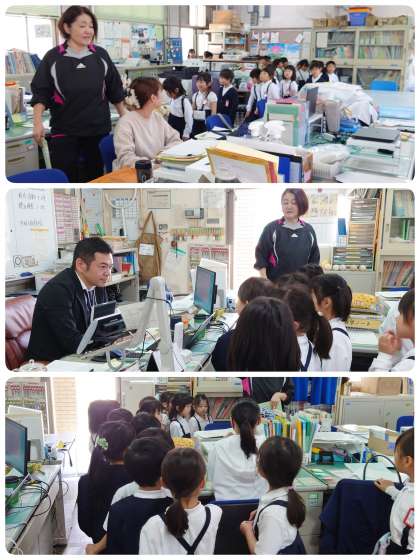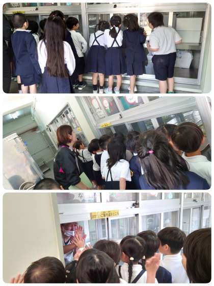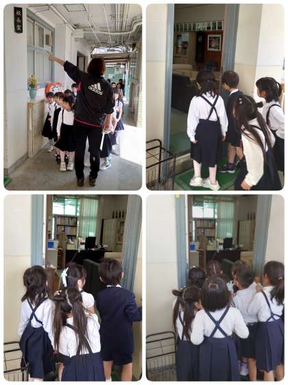 2時間目に1年生が学校めぐりをしました。まだ入ったことのない教室がいっぱい。給食室では、児童留りから、今日の給食を一生けんめい作っている給食調理員さんを見ることができました。「がんばってね!」と子ども達は調理員さんに応援コール。校長室をのぞいてたくさんの校長先生の写真が並んでいるのを見てびっくりして、職員室に入って教頭先生とあいさつをして・・・たくさんの初めてのことがいっぱいの1年生でした。
