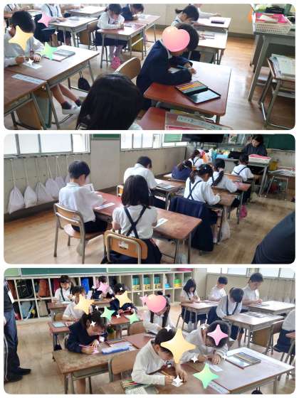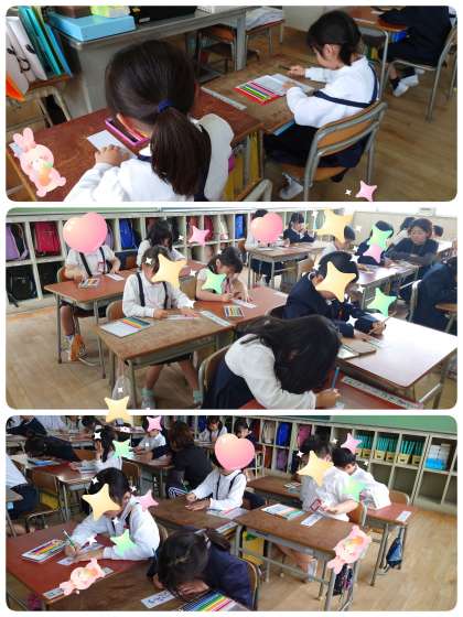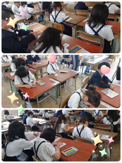 先生が書いてくれた名前の札に色鉛筆で好きな絵を描きました。絵を描いてステキなカードになりました。明日から日直にお仕事が始まるそうです。
