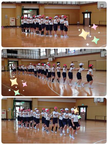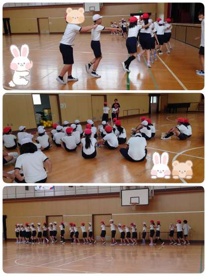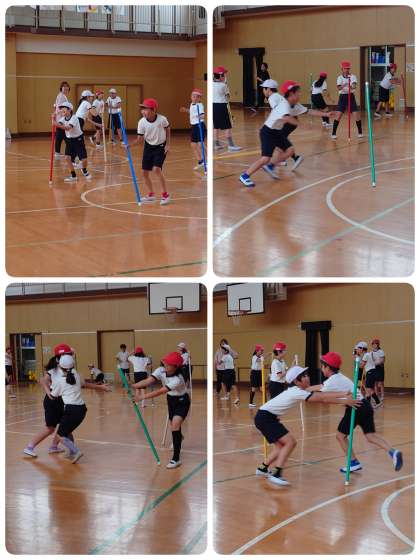 体育の時間はいつも楽しそうな声が職員室まで届きます。今日は5年生が、体ほぐしの運動や器具(棒)を使った運動をしていました。クラス全員の気持ちが一つになるようなゲームでは、最後にみんなが一列になっていました。笑い声がいっぱいです。棒を使った運動では、棒を倒さないように素早く動く運動です。せーのーでタイミングを合わせて動いていました。楽しく体を動かして運動やスポーツが好きな子どもになってくれるとうれしいです。