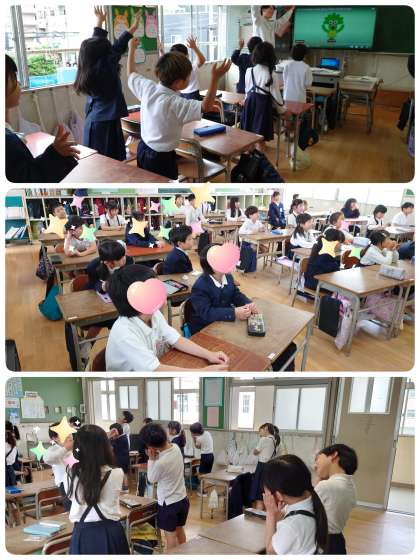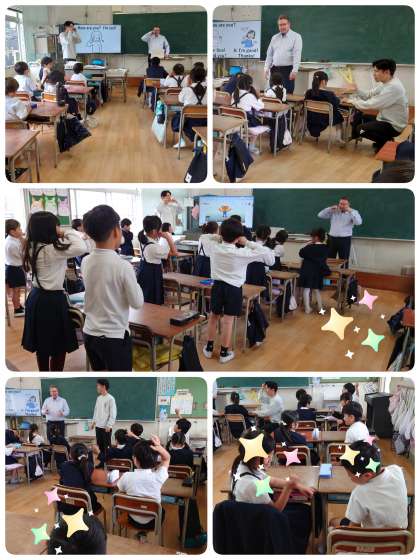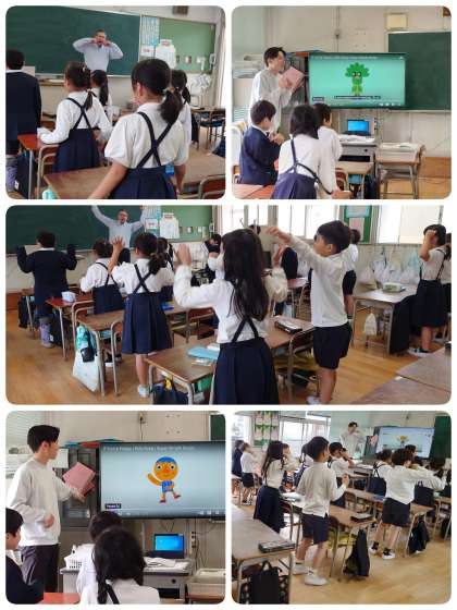 1時間目にC-NETの先生と英語の学習をしました。あいさつをしたり、体を使った英語の手遊び歌のIf you're happy and you know it(幸せなら手をたたこう)を楽しんだり、アルファベットの歌を歌ったり、どんどん英語の学習が進みました。子ども達はとっても楽しそうに活動して英語に親しむことができました。(*^^*)