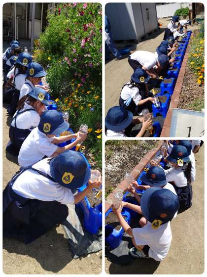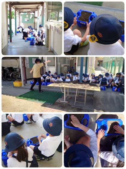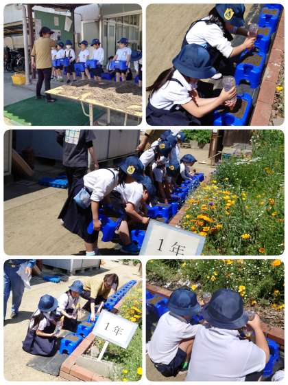 2年生に引き続き、2時間は1年生が植木鉢にアサガオの種をまきました。