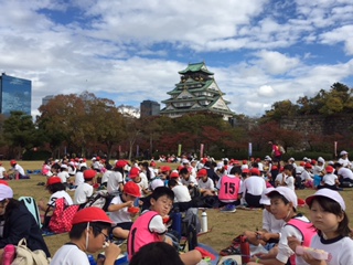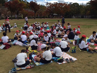 11時30分から西の丸庭園で、なかよし班ごとに昼食をとりました。全校児童全員が、同じところで昼食をとるのは初めてです。昼食後は、早速班ごとで、だるまさんが転んだやおにごっこなどをして、芝生の上を走り回りました。