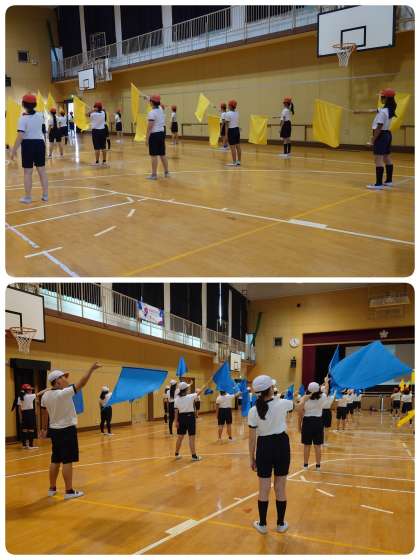 運動会の団体演技で、5・6年生はフラッグを使います。まだ練習を始めたところで、動き方を一つずつ確認しながら練習をしていました。フラッグの音がそろうととてもかっこいい演技です。子ども達も音を感じながら動きがそろっているのを感じていました。