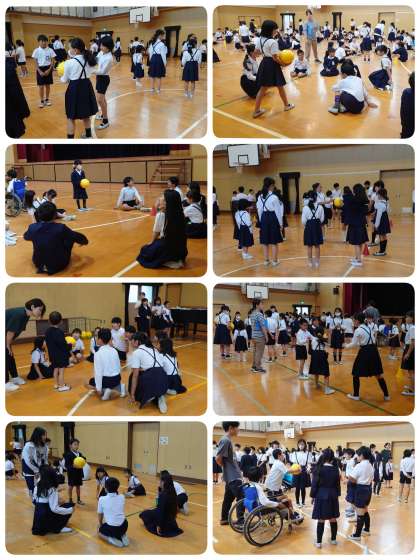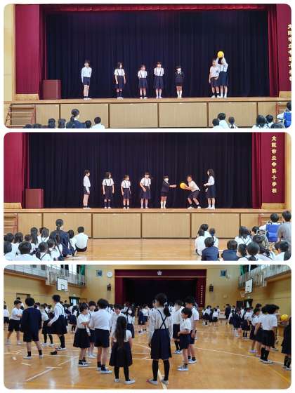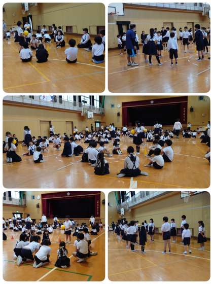 集会は、「ゴロゴロドッカーン」のゲームでした。たてわり班ごとに円になってボールを時計回りに回していきます。鳴らしている鈴が止まった時にボールを持っている人が自己紹介。学年と名前、ゲームの1回目は好きな色、2回目は好きな動物、3回目は食べ物、4回目はスポーツを付け加えて話します。ドキドキの表情の子もいましたが、がんばっていました。ゲームの中で自己紹介ができなかった子は順番に学年と名前を言っていきました。これでメンバーの紹介ができたので、来週からいろいろなゲームをして楽しみます。