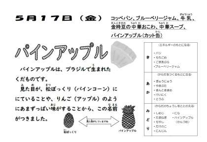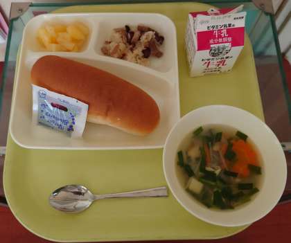 今日の献立は、中華スープに金時豆の中華おこわ、パインアップル、コッペパンとブルーベリージャム、牛乳です。