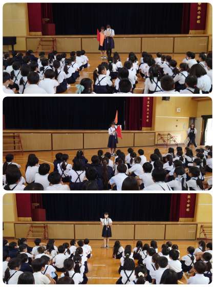 *健康委員会からは、熱中症の「危険」と「厳重警戒」を知らせる旗の説明がありました。これからどんどん暑くなってきます。水分補給等十分気をつけていきたいと思います。