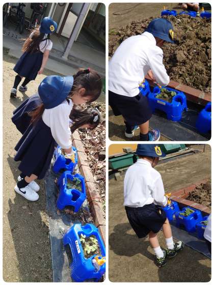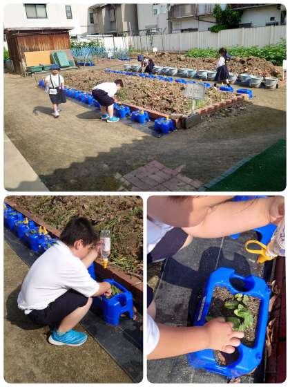朝の時間、1年生はアサガオの水やりに大忙し。次から次へと1年生が学習園になってきてペットボトルにお水を入れて、水がなくなるまで水やりをしています。たくさん双葉が出てきて、数を数えてはうれしそうにしている子ども達です。