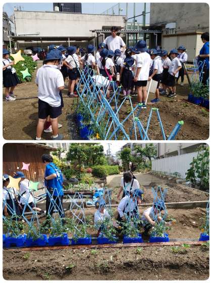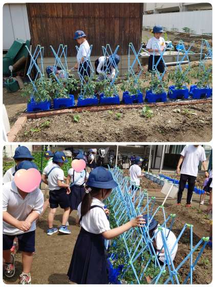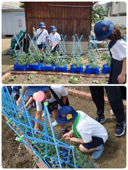 生活科の学習で、学習園で育てているミニトマトの観察に行きました。黄色いかわいい花が少しずつ咲き始めて、もう小さい緑色のトマトができ始めていました。小さい小さいトマトを発見して子ども達は大喜びでした。これからもしっかりお世話をします。