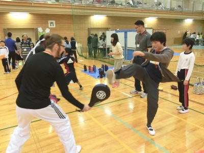 全市から5・6年児童が約350名参加し、約100名のC-NETとともに、ゲームや対話型活動を通して世界の国々の文化について学び、積極的に英語でコミュニケーションを図り、生き生きと楽しみながら活動になりました。午前中はテコンドー、クリケット、ホッケー、フリスビー、マリオゴルフなどのスポーツをしました。午後からは、トーテムポール、フラッグづくりを行いました。