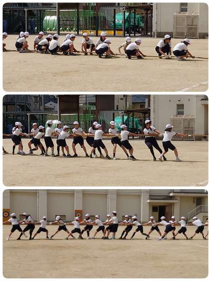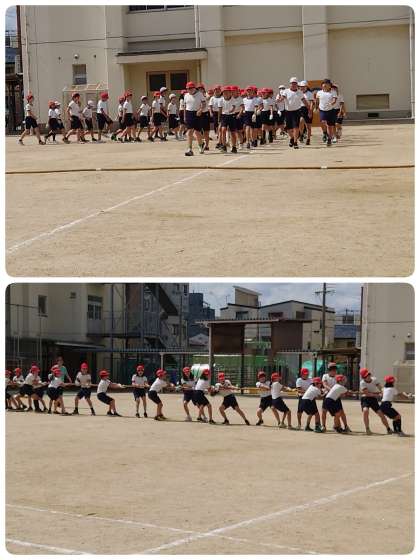 今日は初めて本番と同じように綱引きをしてみました。アナウンスは5年生の子どもです。さすが高学年。先生の話をよく聞いて、さっと行動に移すことができます。場所の移動もさっと理解できました。勝負になると気合が一層入ります。どっちが勝つのかな?