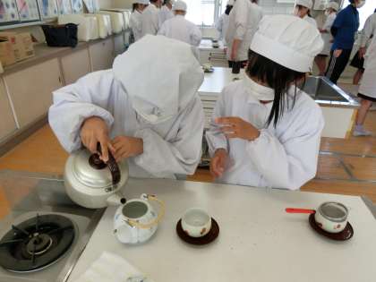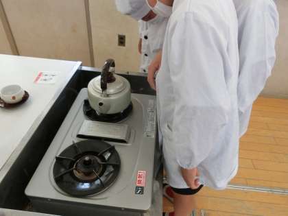 4時間目に初めて調理実習をしました。お湯を沸かし、急須に茶葉をいれて、しばらく蒸らしてから湯呑に注ぎました。