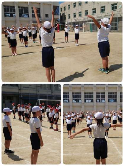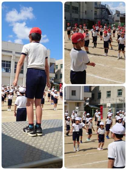 入場行進・開会式に続いて、はじめの体操をしました。指揮台に立っている6年生も前に出ている代表の子ども達もきびきびと体を動かしでラジオ体操第一をしています。何でも一生けんめいがんぱる中浜の子ども達はとってもステキです。