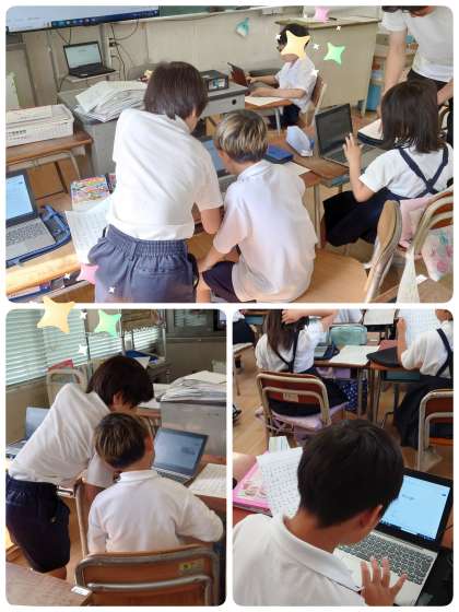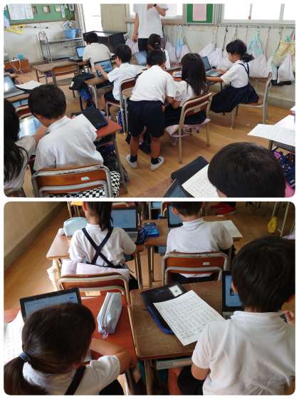 2年生の1時間目の学習、タイピングの学習をしていました。ローマ辞表を確認しながら、タイピング練習をしていました。みんなで相談しながら、先生から出された文字を入力していました。