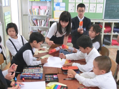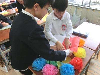 お花紙で花束のお花作り、画用紙とお花紙を使って、ケーキに飾るロウソク作りを行いました。最後は、一人ずつエコ風船につける感謝のメッセージ作りを行いました。高学年の児童が、低学年に親切に教えている光景は、ほほえましく感じました。