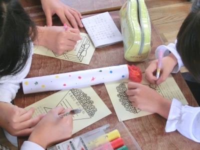 11月17日(火)2限、なかよし班では各教室に分かれて、「おおきに中浜。100才おめでとう集会」準備会を行いました。 各班のリーダーから集会のプログラム紹介や準備物の説明があり、作業に取りかかりました。