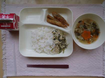 とりなっ葉いためは、ほぐしたささみとだいこん葉を炒めて作ります。缶詰のささみを使うと、家でも簡単に作れます。(給食にはツナを使ったものも登場しますよ。)ごはんのお供に最適です。