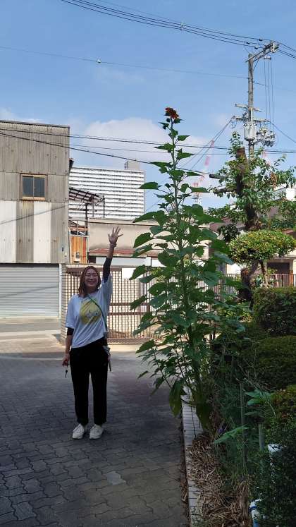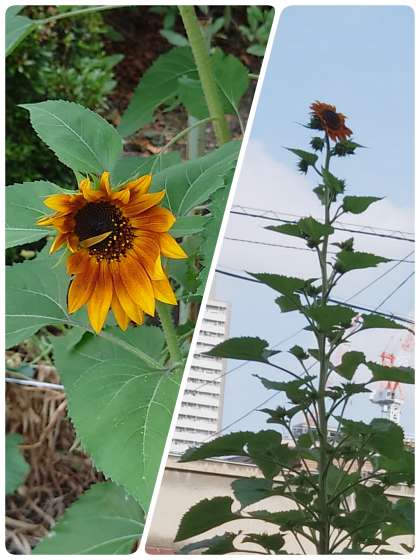 正門前のヒマワリの花が咲きました。ヒマワリの背は3mぐらいありそうです。花はてっぺんに1輪、下のほうに1輪で、小さくて濃い黄色をしています。つぼみがたくさんついているのでこれから次々開花します。