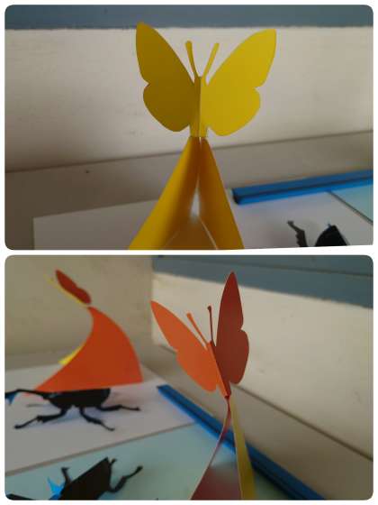 紙工作でカブトムシとチョウチョを作ってくれたので、校長室前に飾りました。細かいところまで上手にできています。かっこいいです。