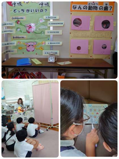 今日は朝から4・5・6年の歯科検診でした。保健室で歯科検診をしている間に、半数の待っている子ども達は隣の部屋で歯に関する資料を読んだりゲームをしたりしていました。保健室の先生がたくさん資料などを毎回作ってくれています。歯についてとても分かりやすい資料やゲームで、子ども達は楽しく学んでいます。