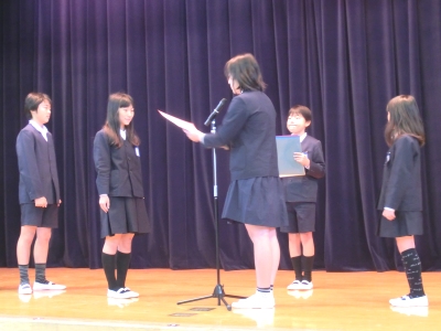 また、児童会からは11月10日(火)に開催した全校遠足「ハッピースマイルウォーク」の優勝・準優勝チームの「なかよし班」へ表彰授与【写真右】がありました。