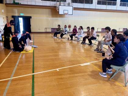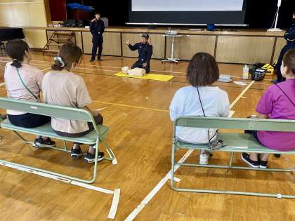 6月14日(金)水泳学習が月曜日から始まるので、教職員で救急救命研修会を実施しました。城東消防署から3名の救急隊の方に来校してもらい心肺蘇生やAEDの使い方を教わりました。人形を使って胸骨圧迫やAEDを使う研修もありました。