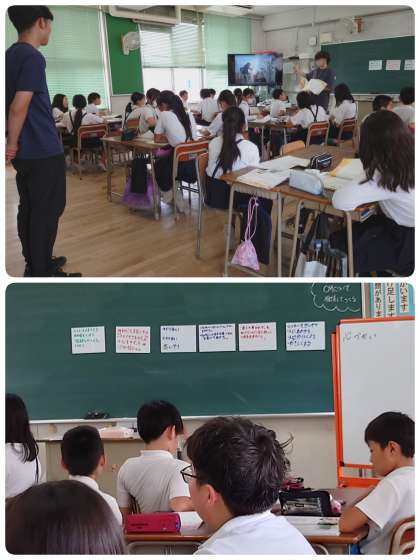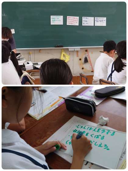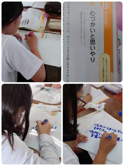 道徳の「心づかいと思いやり」の学習で、担任の先生が質問しました。さっそく子ども達は話合いを始めました。短い時間の中で自分の思ったことをどんどん発表して、ホワイトボードにまとめていきました。子ども達の話し合う力がどんどん伸びてきています。