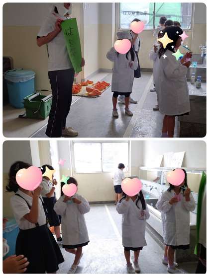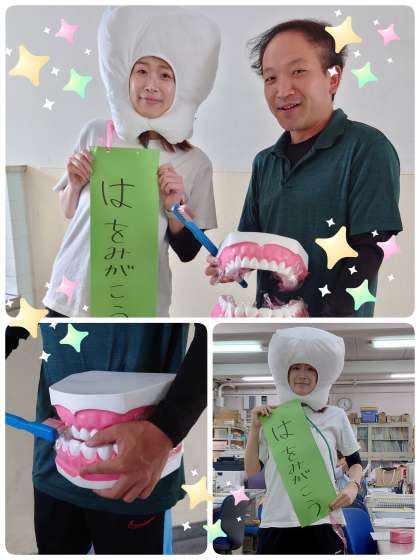 今日の歯みがきタイムに「歯の妖精」が登場しました。健康週間で「歯をみがこう」と子ども達に呼びかけました。子ども達はかわいい「歯の妖精」に大喜び。「歯の天使」「歯の女神」など、子ども達はいろいろな名前をつぶやいていました。子ども達は大きな歯のモデルを使って歯みがき練習をしていました。明日はどこに現れるか楽しみです。