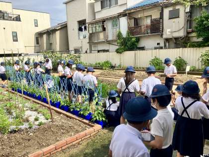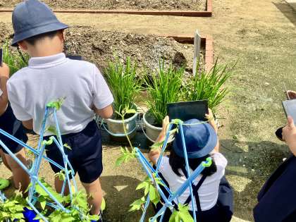 5年生、総合ていな学習の時間です。社会の学習「米作りのさかんな地域」で学習したお米について、バケツを使って、自分たちで米づくりに挑戦しています。稲の育ちを学習者用端末を使て記録しています。